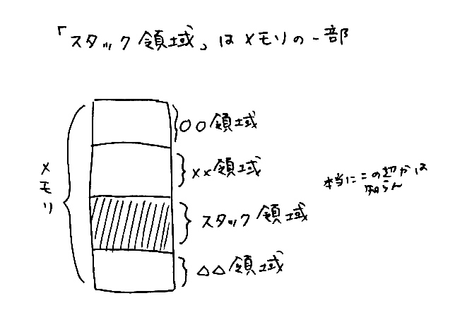 「スタック」は「スタック領域」のことです。メモリの中にいくつか○○領域ってがあるんだけどその内の一つ