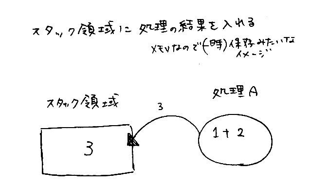 例えば1+2する処理があったとして、その結果をスタック領域に格納するんですよ