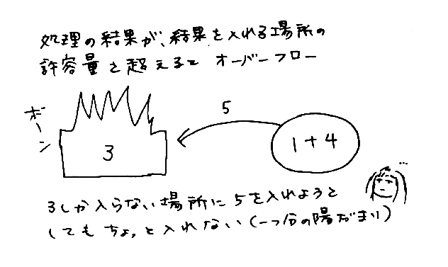 けどもしも、 1+4処理の結果 = 5 を格納したいのに、入れる場所のサイズが3しかなかったらはみ出しちゃいますよね こんな感じでオーバーフローします