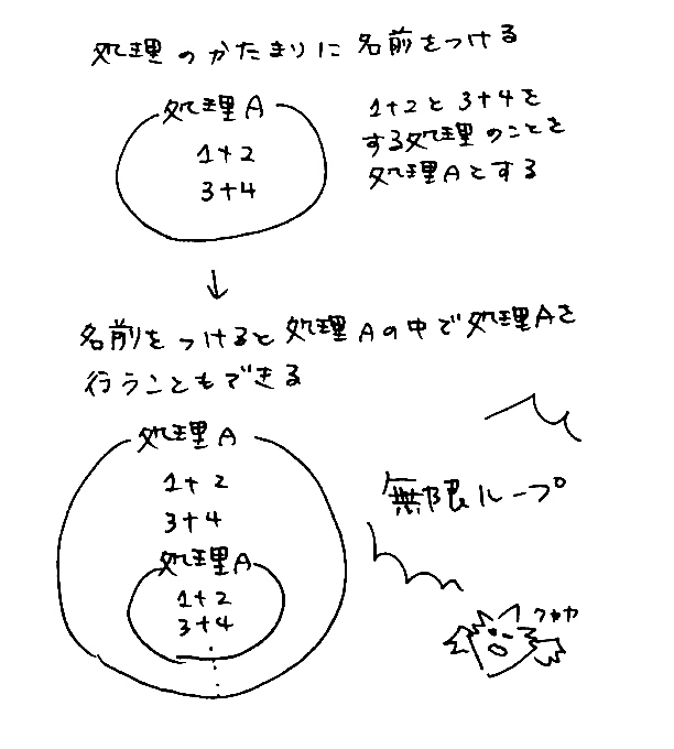 "1+2する→3+4する→処理Aする"までを「処理A」にできちゃうんですね…何言ってんだお前