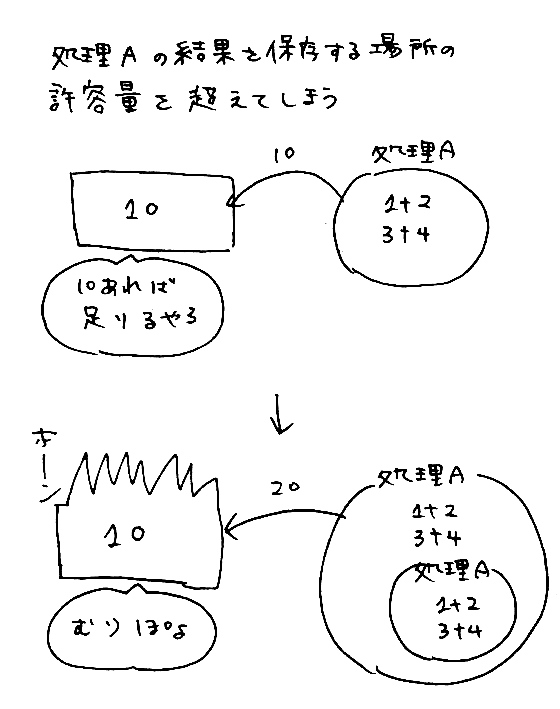 同じ処理を何度も繰り返すなどして処理の結果が膨大になった結果、処理の結果を入れる場所に収まりきらなくなってしまう という感じです