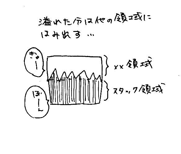 ✕✕領域も✕✕領域で本来別の使い途がある場所なので、そこにスタック領域からはみ出た数値があると「誰だてめぇどこ中だあーん」ってなっちゃうんですよね。これでエラーが出たりバグったりしますくわばらくわばら