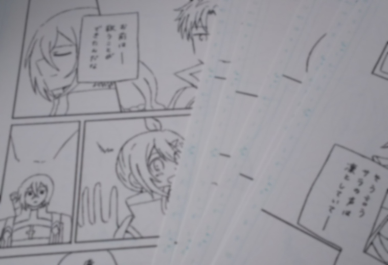 あ、ちなみに上の画像でなんとなくわかるかもしれませんが、今回字は手書きになります。写植しようかとも思いましたが手書きの方が早いなと思ったので……。読める程度の字はしている……つもり……ですので……よろしくお願いします……。